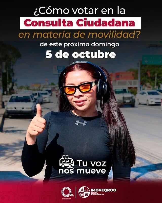 Cancún.— El Instituto de Movilidad de Quintana Roo (IMOVEQROO) invita a la ciudadanía a participar en la Consulta Ciudadana en Materia de Movilidad #TuVozNosMueve, que se llevará a cabo este domingo 5 de octubre de 9:00 a.m. a 4:00 p.m. Con 48 buzones distribuidos en todos los municipios del estado, esta iniciativa busca recoger las opiniones de los habitantes para moldear el futuro del transporte público.