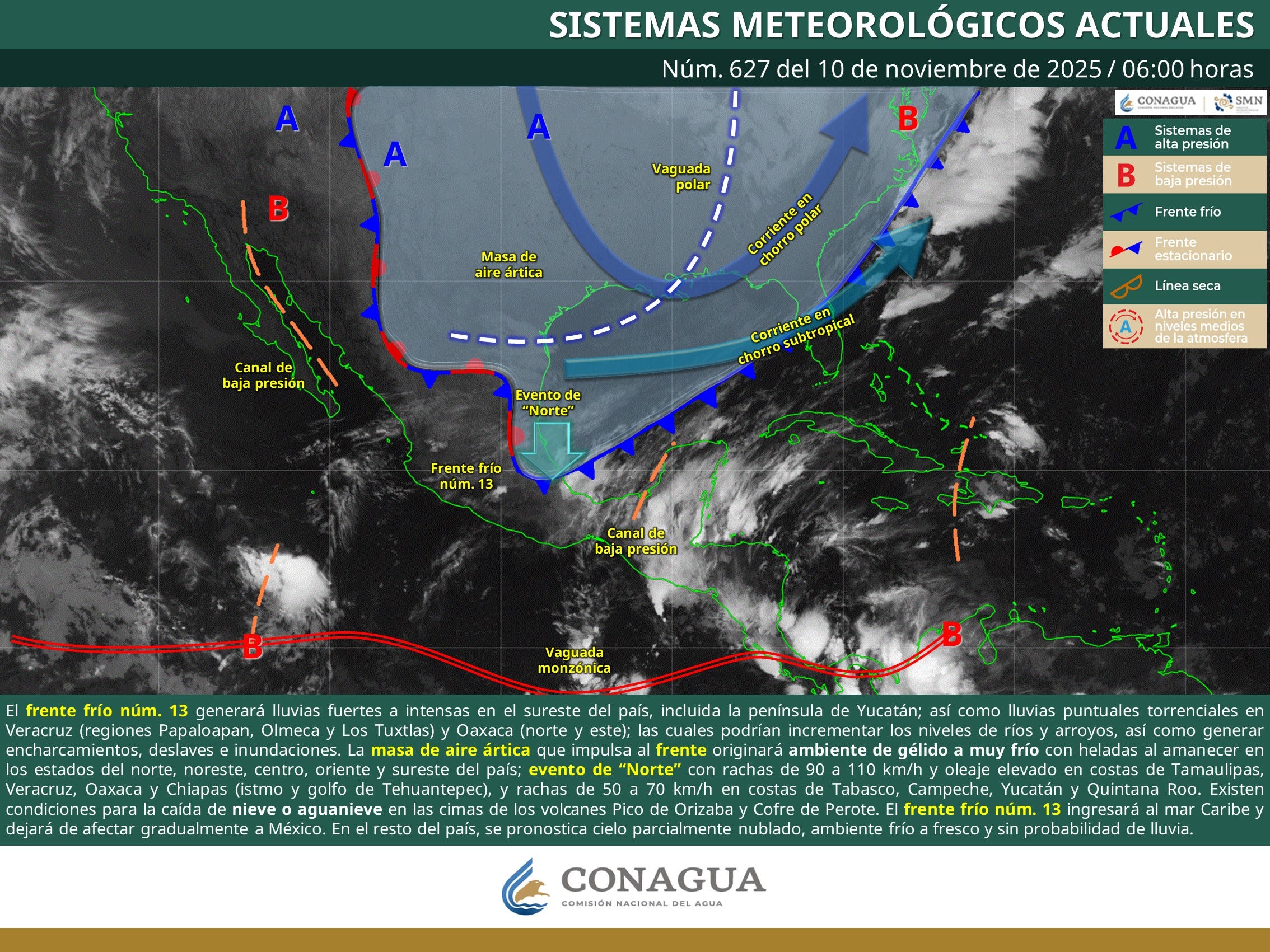 Chetumal.- ¡Buenos días, familia quintanarroense! . Este lunes 10 de noviembre nos recibe con una vaguada que arrastra humedad del Caribe como si no hubiera mañana, cubriendo todo el estado en un velo nuboso persistente. El termómetro arranca en 24-26 °C, pero no se hagan ilusiones: sube a 31-35 °C en las horas centrales, con esa humedad del 80-90 % que hace que el bochorno se sienta como un abrazo pegajoso de 38 °C. Lluvias intermitentes desde el mediodía, con chubascos de 10-30 mm en la mayoría de las zonas, y puntuales fuertes de hasta 50-60 mm en el sur y centro; descargas eléctricas posibles, así que ojo con los rayos en las playas.