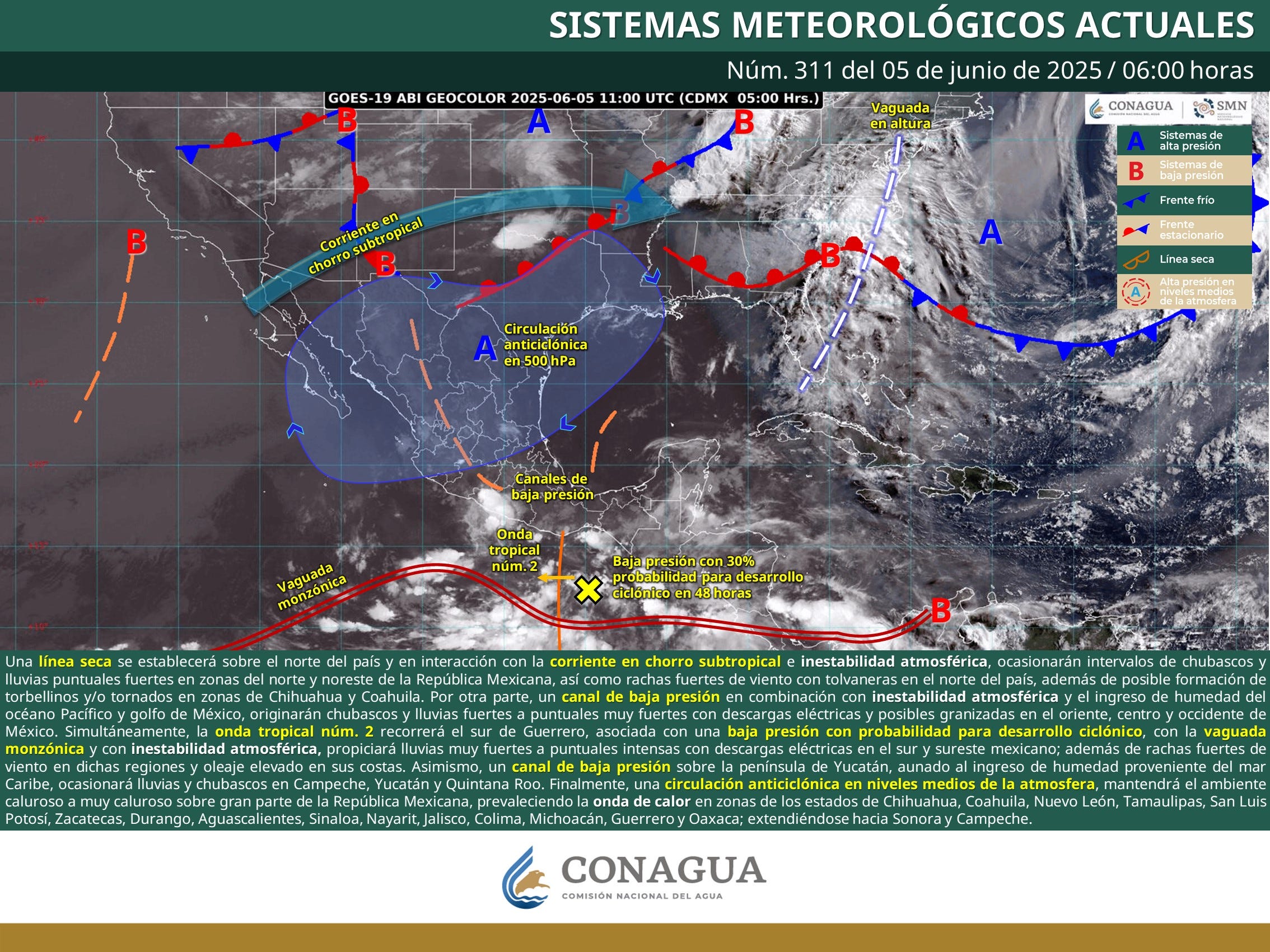 Cancún: Cielo nublado con chubascos y actividad eléctrica. Temperaturas de 34 a 36 °C, sensación térmica de 39 °C. Vientos del este y sureste de 25 a 35 km/h con rachas más fuertes. Mareas altas a las 06:04 h y 18:42 h; mareas bajas a las 00:13 h y 12:36 h. Salida del sol: 06:06 h. Puesta del sol: 19:29 h.