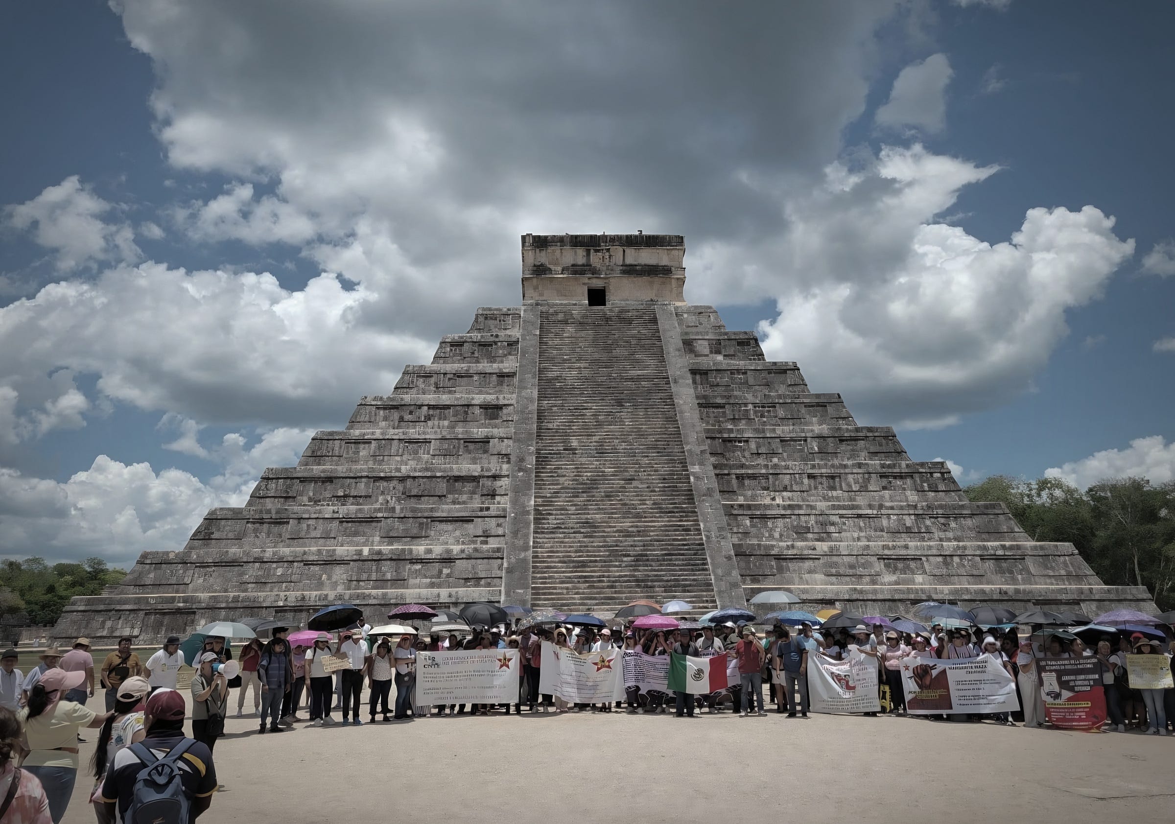 Mérida.— Este miércoles, docentes de la Coordinadora Nacional de Trabajadores de la Educación (CNTE) en Yucatán tomaron las zonas arqueológicas de Chichén Itzá, Uxmal y Ek Balam para protestar contra la reforma al sistema de pensiones del ISSSTE de 2007.