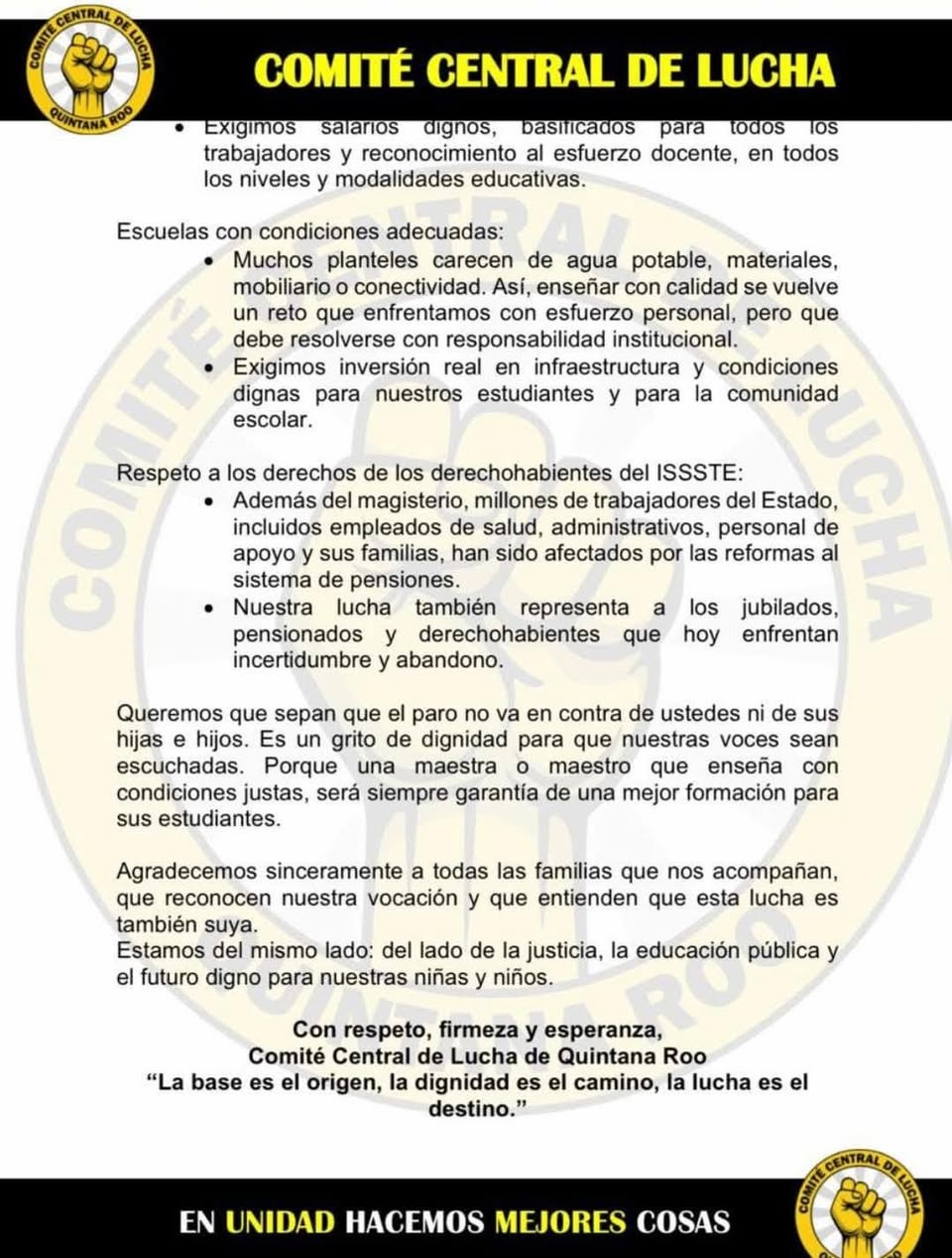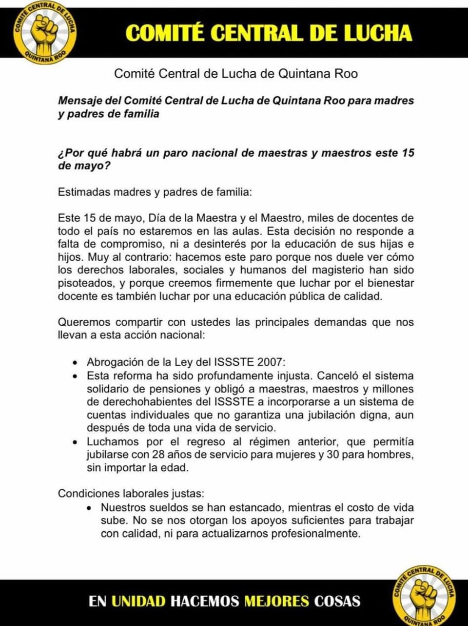 Chetumal.- El próximo 15 de mayo, el Comité Central de Lucha (CCL) se unirá al paro nacional de labores convocado por la Coordinadora Nacional de Trabajadores de la Educación (CNTE), un movimiento que amenaza con paralizar el sistema educativo mexicano. La chispa que encendió esta protesta es la exigencia de derogar la reforma de 2007 a la Ley del Instituto de Seguridad y Servicios Sociales de los Trabajadores del Estado (ISSSTE), que reemplazó el Sistema Solidario de Pensiones por un modelo de cuentas individuales, dejando a miles de docentes sin una jubilación digna.