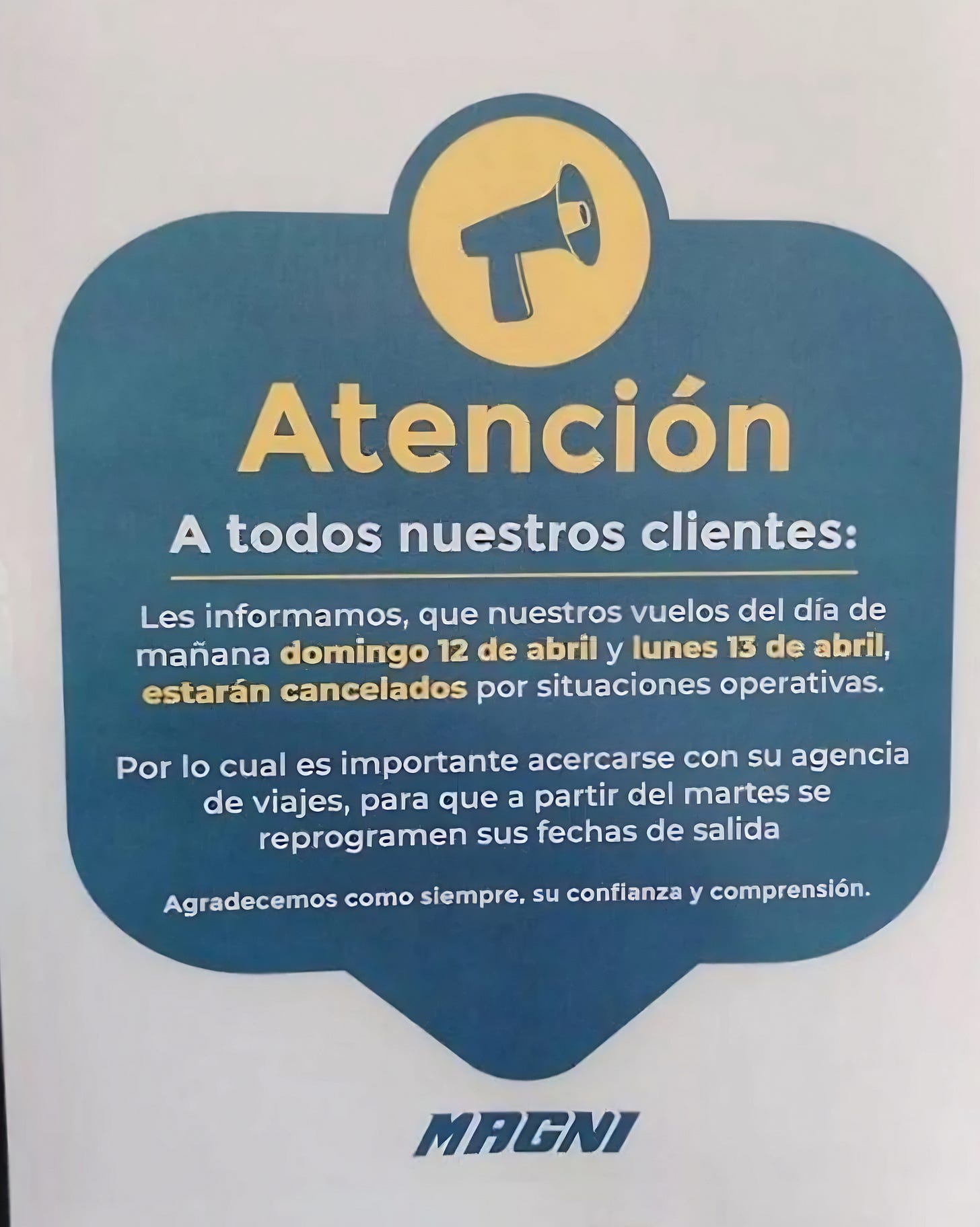 Es preocupante que una aerolínea que se promociona como “la aerolínea turística de México” deje tirados a sus pasajeros en el cierre de Semana Santa sin personal en los aeropuertos y con un comunicado que suena más a excusa que a plan de contingencia. La intervención de ASUR, Profeco y otras aerolíneas nacionales evidencia que el sector privado y las autoridades tuvieron que resolver un problema que Magnicharters no atendió.