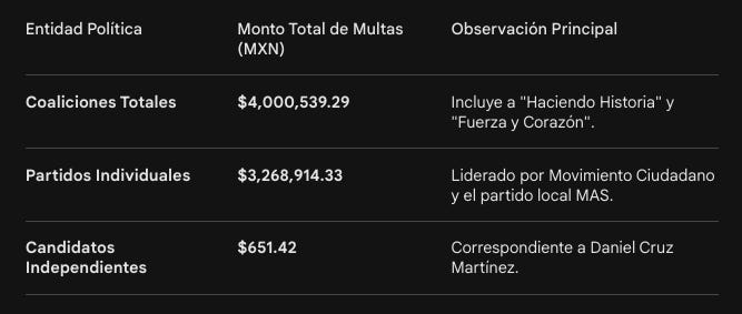 El PAN enfrenta cuatro multas específicas (una de forma y tres de fondo), mientras que en el caso del PRD, la deuda de más de 431 mil pesos deberá liquidarse independientemente de su proceso de pérdida de registro como instituto político. Por su parte, Movimiento Ciudadano destaca por ser el partido individual con la mayor observación, al no poder comprobar gastos por casi 1.8 millones de pesos de su campaña pasada.