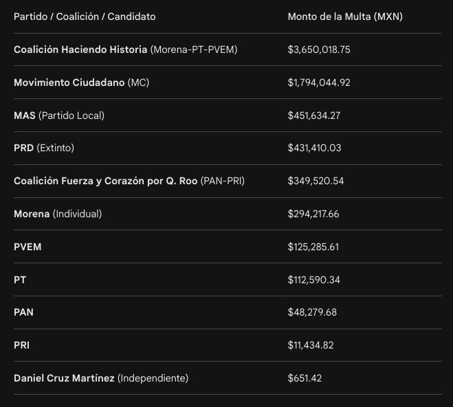 Cancún.— El Consejo General del Instituto Nacional Electoral (INE) confirmó las sanciones económicas para los actores políticos de Quintana Roo tras la revisión de gastos de campaña del proceso 2023-2024. La cifra más alta corresponde a la Coalición “Haciendo Historia por Quintana Roo” (Morena-PT-PVEM) con una multa de 3 millones 650 mil 018.75 pesos, seguida por Movimiento Ciudadano con 1 millón 794 mil 044.92 pesos, el partido local MAS con 451 mil 634.27 pesos, y el extinto PRD con 431 mil 410.03 pesos.