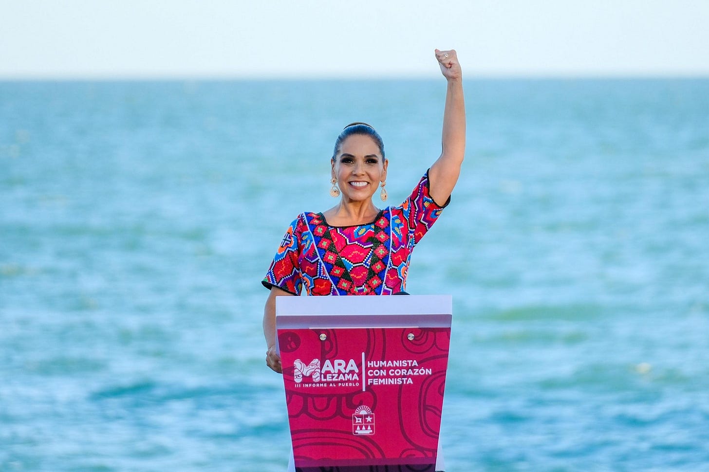 Mara Lezama aseguró que al llegar al Tercer Informe de Gobierno lo hace con mucha emoción, con la satisfacción profunda de saber que se sigue el rumbo propuesto, de honrar el compromiso asumido desde el primer día de este gobierno humanista con corazón feminista, de aplicar una nueva forma de gobernar, de cara a la gente, sin mentiras ni dobles discursos, con honestidad, valentía, transparencia, austeridad y con eficiencia.