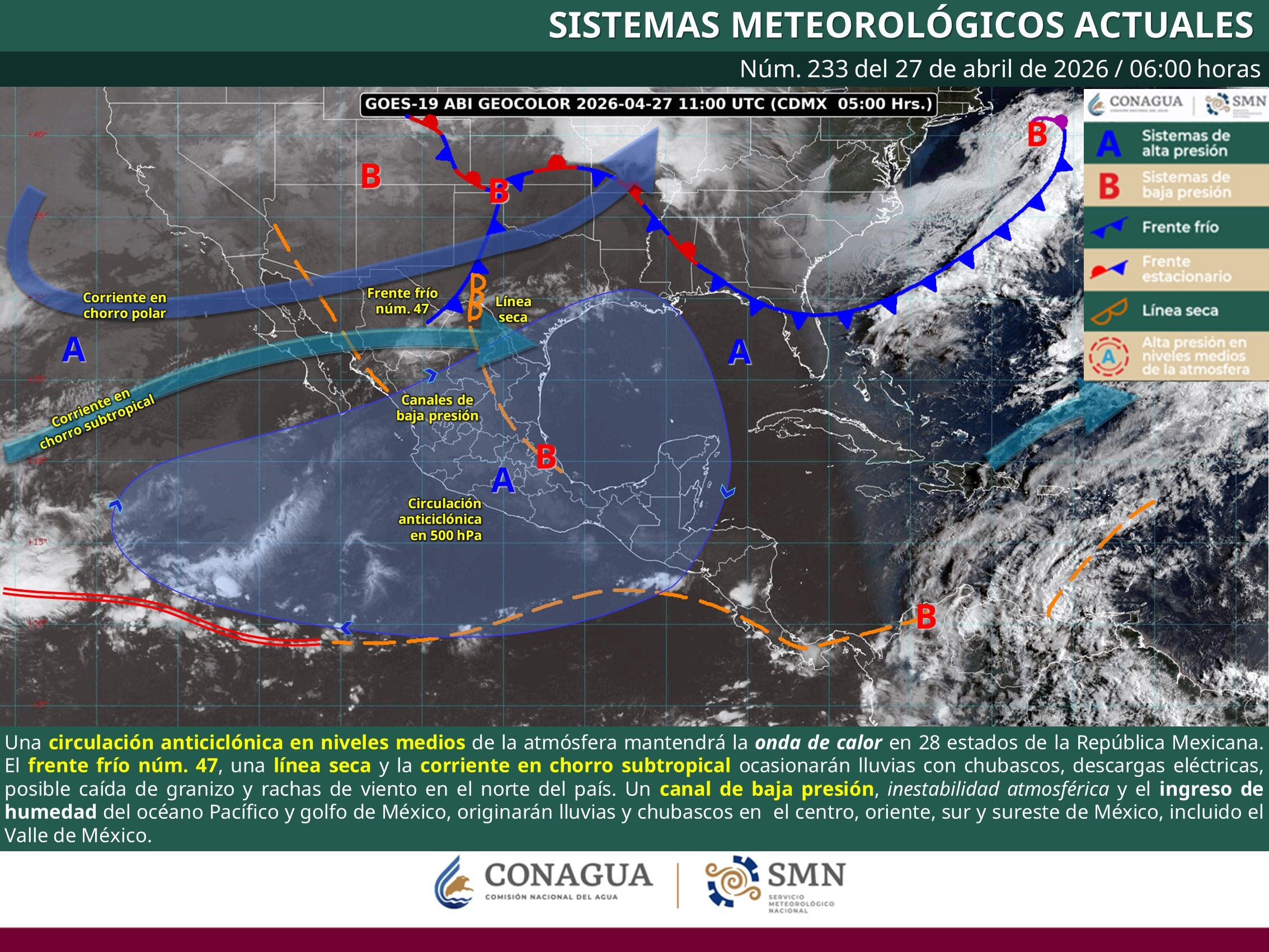 Aunque no se esperan lluvias significativas, el cielo podría estar medio nublado en algunos puntos costeros. El frente frío número 47 afecta solo el norte del país, por lo que aquí seguimos bajo el domo de calor.