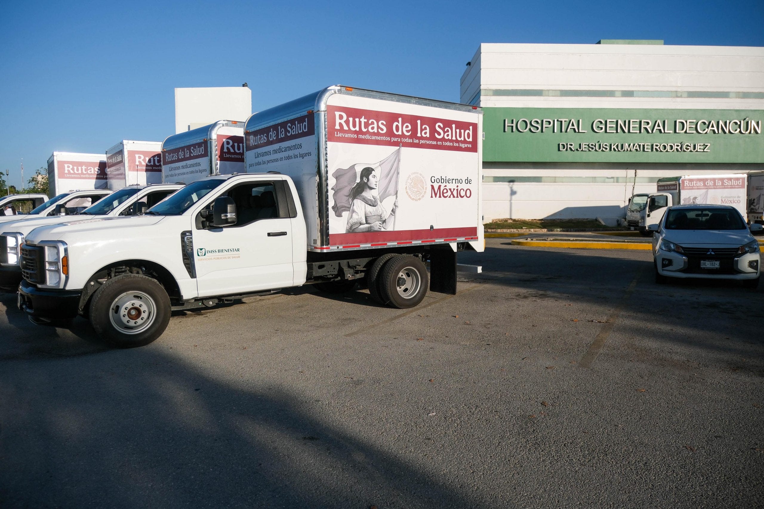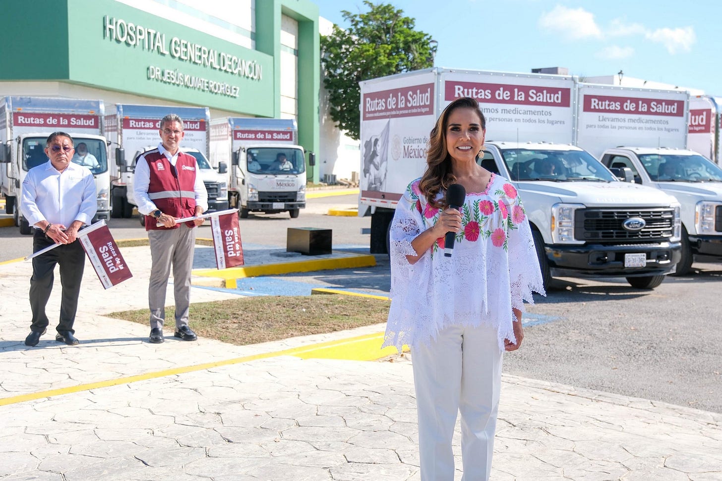 Acompañada del secretario de Salud Flavio Carlos Rosado, y del coordinador del IMSS-Bienestar en la entidad, Moisés Toledo Pensamiento, la gobernadora Mara Lezama informó que aquí en Quintana Roo, con los vehículos asignados, se logrará la distribución de los medicamentos a través de 31 rutas en esta primera semana, con 166 mil piezas de insumos médicos para 171 unidades médicas de primer nivel.