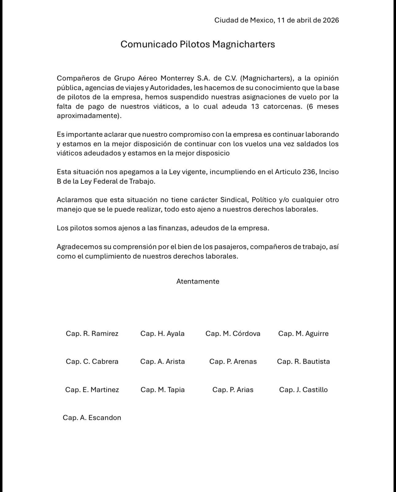A través de un comunicado emitido este 11 de abril de 2026, los pilotos denunciaron que la empresa arrastra un adeudo de viáticos de aproximadamente seis meses. Amparados en el Artículo 236 de la Ley Federal de Trabajo, los capitanes aclararon que no se trata de un movimiento político o sindical, sino de una medida desesperada ante la imposibilidad de sostener sus labores sin los pagos correspondientes.