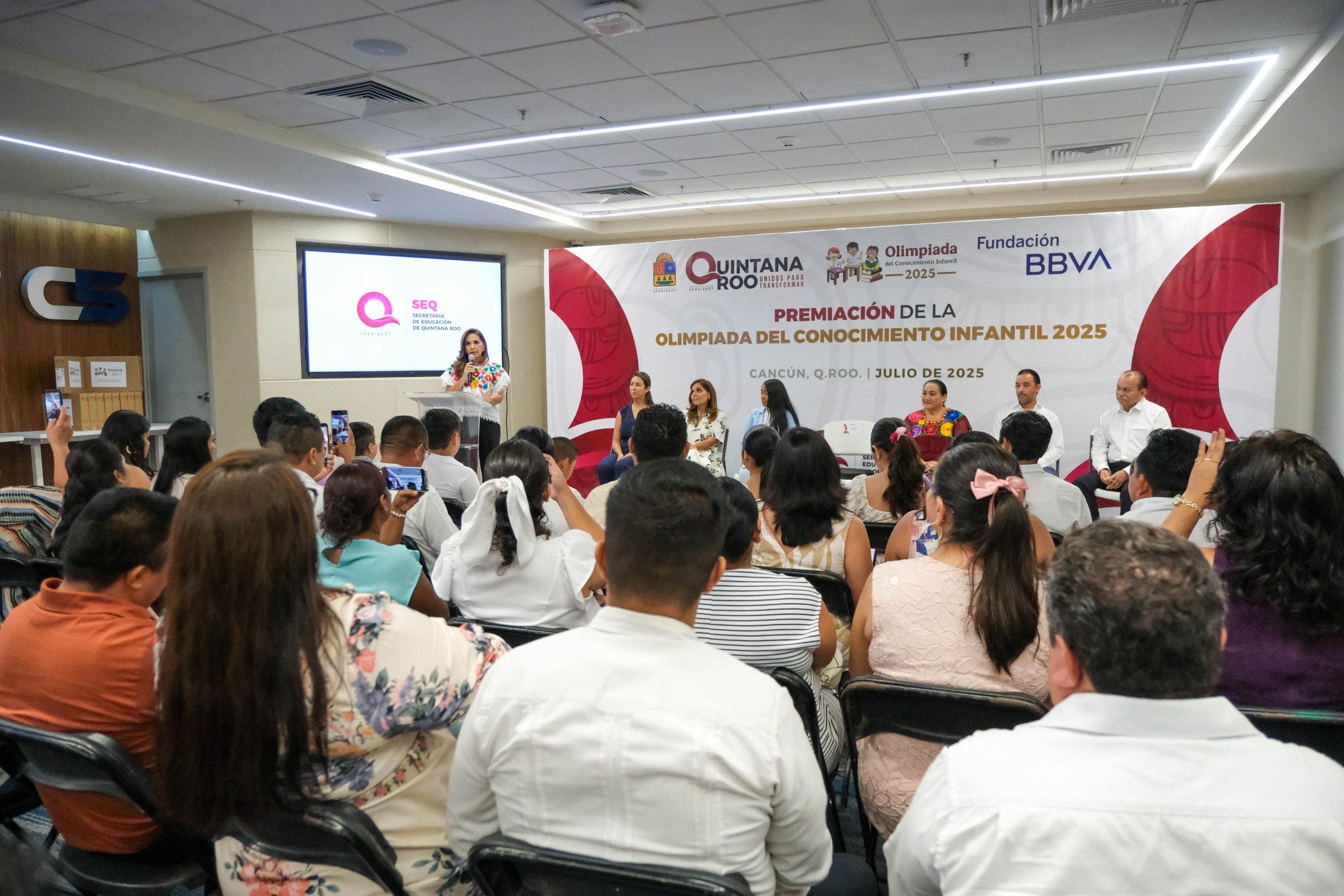 Por su parte, la secretaria de Educación, Elda Xix Euán, explicó que la Olimpiada del Conocimiento Infantil 2025 es una celebración del saber, del esfuerzo y del compromiso, un espacio de reconocimiento a quienes han demostrado excelencia en sus aprendizajes, constancia en sus estudios y amor por el conocimiento. Les pidió seguir adelante, que tengan muchos sueños y que no olviden de dónde vienen.