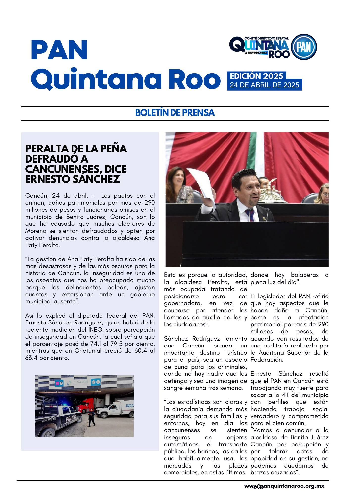 Cancún.— El diputado federal de Acción Nacional, Ernesto Sánchez Rodríguez, anunció que denunciará a la presidenta municipal de Benito Juárez, Ana Paty Peralta, por actos de corrupción y opacidad en su gestión: “Vamos a denunciar a la alcaldesa de Benito Juárez Cancún por corrupción y por tolerar actos de opacidad en su gestión, no podemos quedarnos de brazos cruzados”. En Cancún, la gestión de la alcaldesa Ana Paty Peralta, de Morena, ha generado un profundo descontento entre los electores, quienes la acusan de pactos con el crimen, daños patrimoniales por más de 290 millones de pesos y omisión frente a la creciente inseguridad. Este malestar ha llevado a ciudadanos a activar denuncias contra la presidenta municipal, dice un boletín del PAN difundido este jueves.