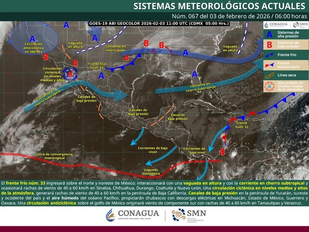 Baja probabilidad de lluvias aisladas y bancos de niebla matutinos en carreteras y zonas rurales. El frente frío 33 se acerca al norte del país sin impactos intensos en la Península por ahora