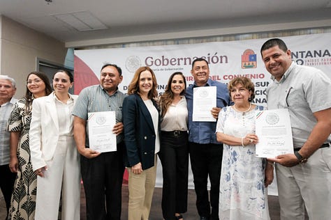 La gobernadora Mara Lezama y Rocío Bárcena Molina, subsecretaria de Desarrollo Democrático, Participación Social y Asuntos Religiosos firman un convenio de este tipo en territorio