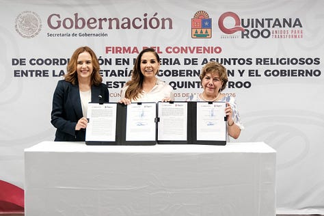 Previamente, la secretaria de Gobierno de Quintana Roo, Cristina Torres Gómez, explicó que el instrumento jurídico firmado es una actualización del Convenio de Coordinación suscrito en 2005 y que establecía acciones conjuntas orientadas a la promoción de la tolerancia religiosa, la cultura de paz y el respeto a la diversidad de creencias en la entidad.