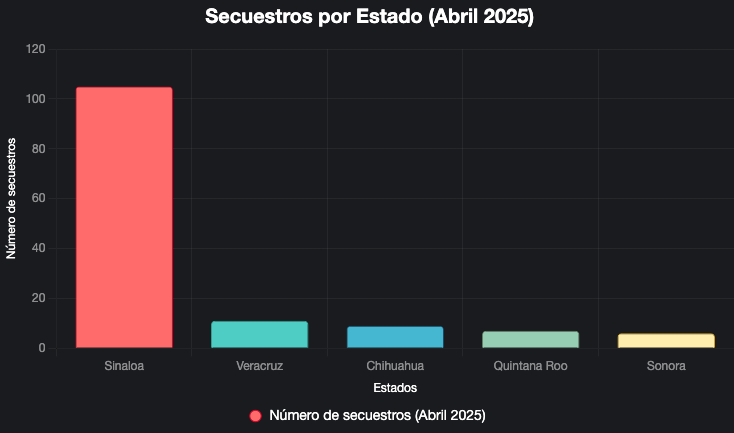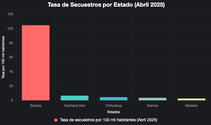 Quintana Roo registró una tasa de 7 secuestros por cada 100 mil habitantes, solo por debajo de Sinaloa, que encabeza la lista con 105 casos en la misma métrica. En números absolutos, Quintana Roo reportó 11 secuestros en abril, una cifra que, aunque menor a la de otros estados en términos absolutos, resalta al ajustarse por población. Este dato posiciona al estado como un foco rojo en materia de seguridad, especialmente considerando su importancia económica y turística.