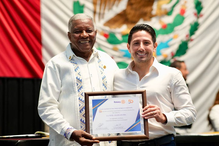 En la sesión ordinaria número 3, la diputada Silvia Dzul Sánchez presidenta de la Mesa Directiva hizo entrega de este reconocimiento a Jean Baptiste Manel N’tab, past gobernador del Distrito Mágico 4195 2024 - 2025 y miembro del Club Rotario de Chetumal.
