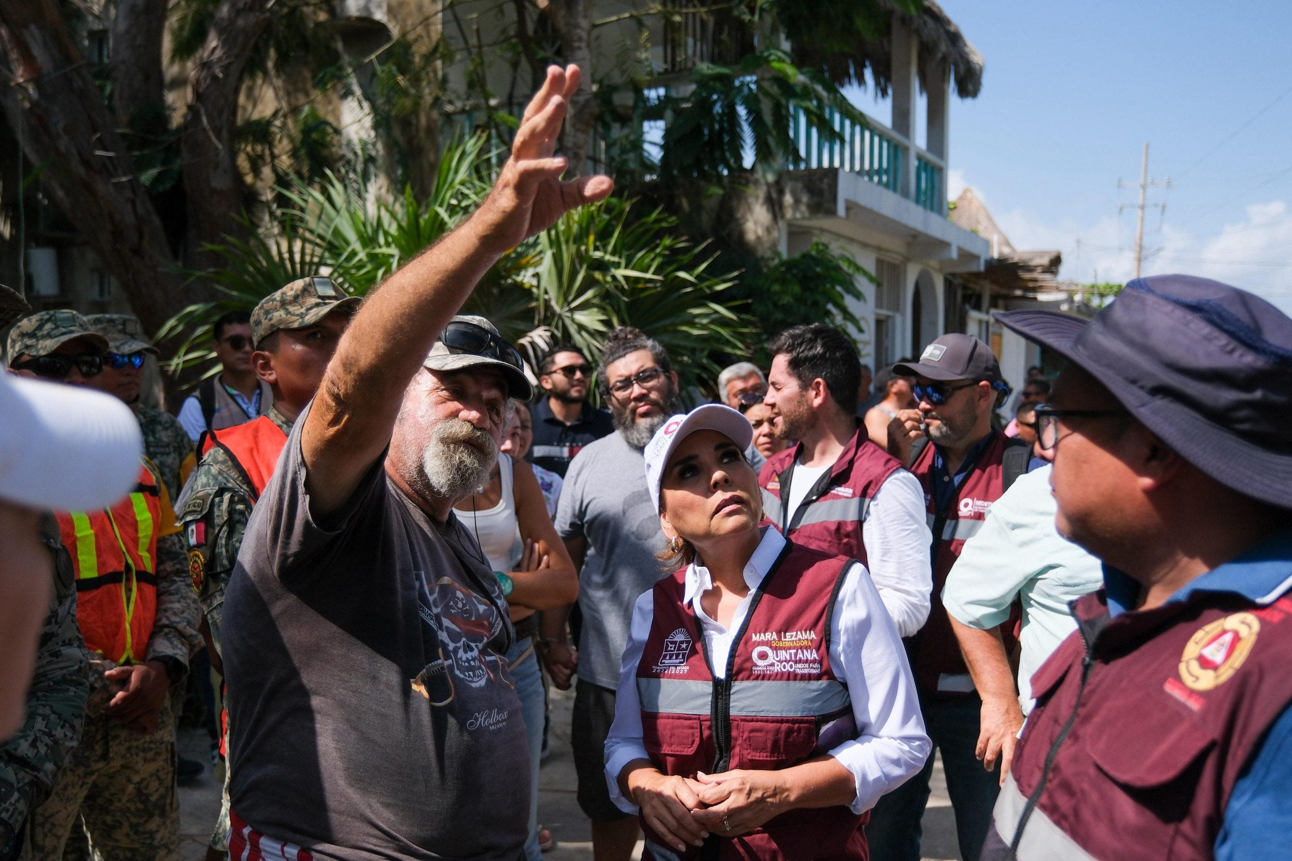 Holbox.- La gobernadora Mara Lezama Espinosa, acompañada del presidente municipal de Lázaro Cárdenas, Nivardo Mena, estuvo en la isla de Holbox, en el sitio donde se registró un incendió en días pasados para escuchar en territorio a los holboxeños y constatar las afectaciones.