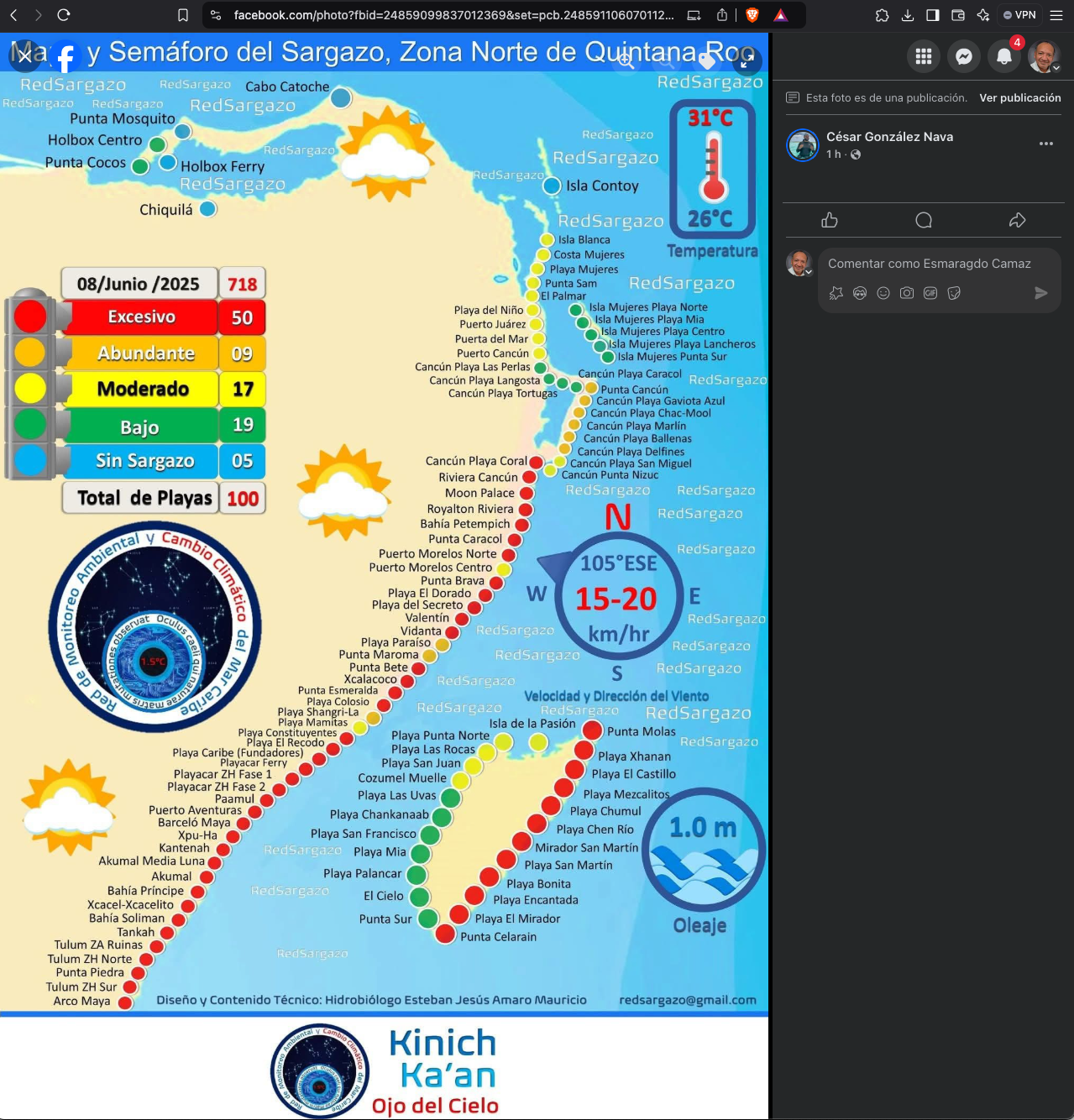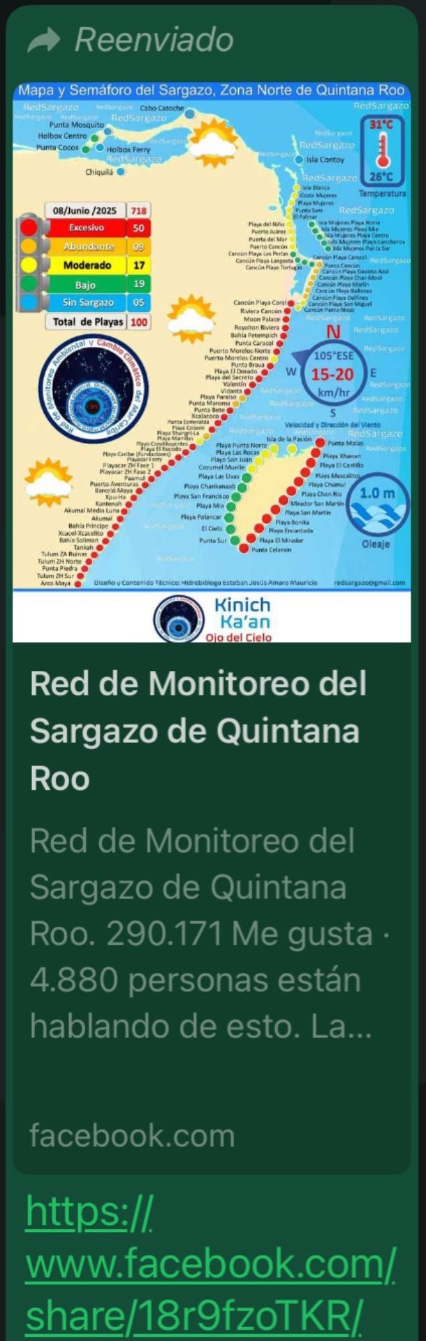 Cancún.— La mañana de este domingo, la Red de Monitoreo del Sargazo de Quintana Roo compartió en su página de Facebook un mapa detallado del semáforo de sargazo para la zona norte del estado, revelando una situación alarmante: de las 100 playas monitoreadas, 50 fueron clasificadas en rojo, indicando un nivel "excesivo" de sargazo. Otras 9 playas registraron niveles "abundantes", 17 "moderados", 19 "bajos" y solo 5 sin presencia del alga, según el informe acompañado del emblemático sistema "Kinich Ka’an ojo del Cielo". El impacto fue inmediato. La publicación, que acumuló 290,171 "Me gusta" y generó conversación entre 4,880 usuarios en pocas horas, expuso la gravedad de la crisis en destinos turísticos clave como Cancún, Playa del Carmen y Tulum, donde el sargazo ha afectado gravemente la actividad económica y ambiental en los últimos años. Sin embargo, la revelación duró poco. Apenas horas después, el enlace a la publicación dejó de funcionar, mostrando un mensaje de Facebook que indicaba que la página no estaba disponible, sugiriendo que el contenido fue retirado o eliminado.