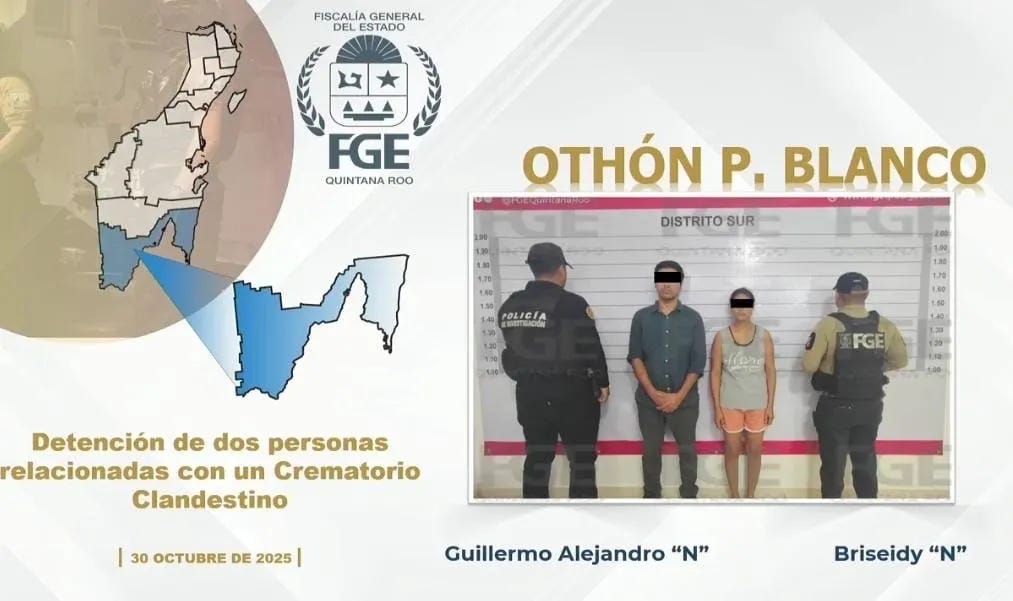 Durante la conferencia de seguridad realizada en la sede del C5 en Cancún, el fiscal Raciel López Salazar informó que los detenidos —Guillermo Alejandro “N”, propietario del crematorio, y Briseidy “N”, su presunta cómplice— enfrentan los delitos de medio ambiente y fauna, así como fraude.