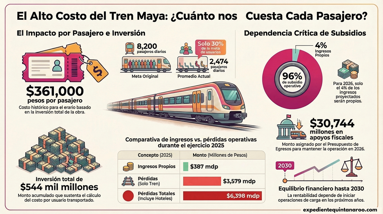 Este cálculo se basa en el costo total del proyecto —544 mil millones de pesos— dividido entre los 1 millón 504 mil 319 pasajeros acumulados desde su inauguración el 8 de diciembre de 2023 hasta el 11 de agosto de 2025 (última cifra pública detallada y consistente en los reportes financieros revisados en lo que va del primer trimestre de 2026).