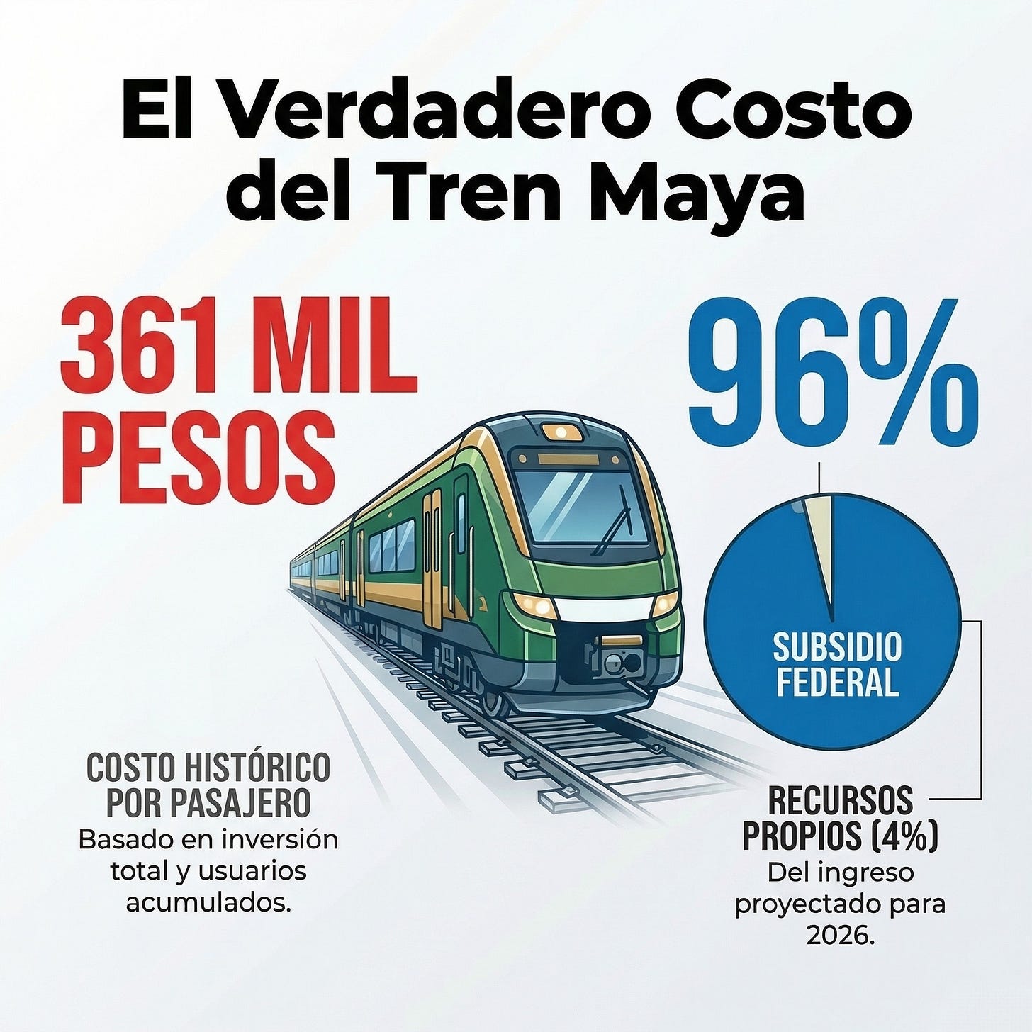 CDMX.— De acuerdo con los estados financieros oficiales más recientes del Tren Maya y Grupo Mundo Maya, publicados y analizados en reportes de marzo de 2026 (basados en información de Sedena), cada pasajero transportado representa un costo histórico de 361 mil pesos para el erario federal.