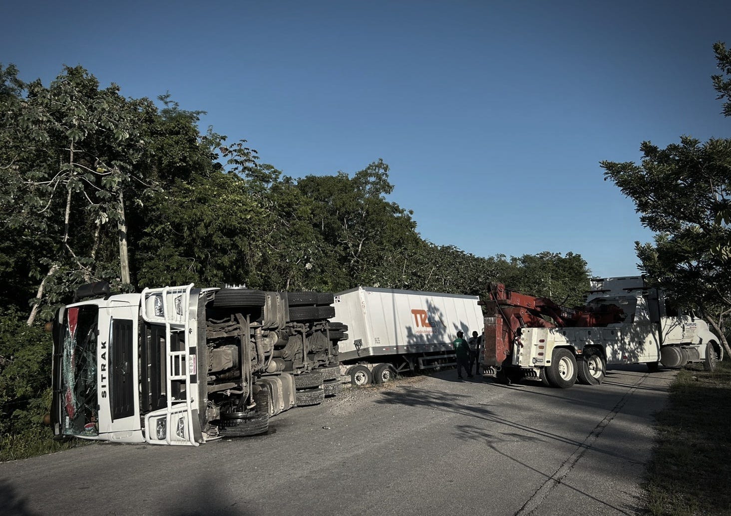 Se regó la leche: Tráiler de "Lala" vuelca en carretera Tintal-Tren Maya, en Playa del Carmen