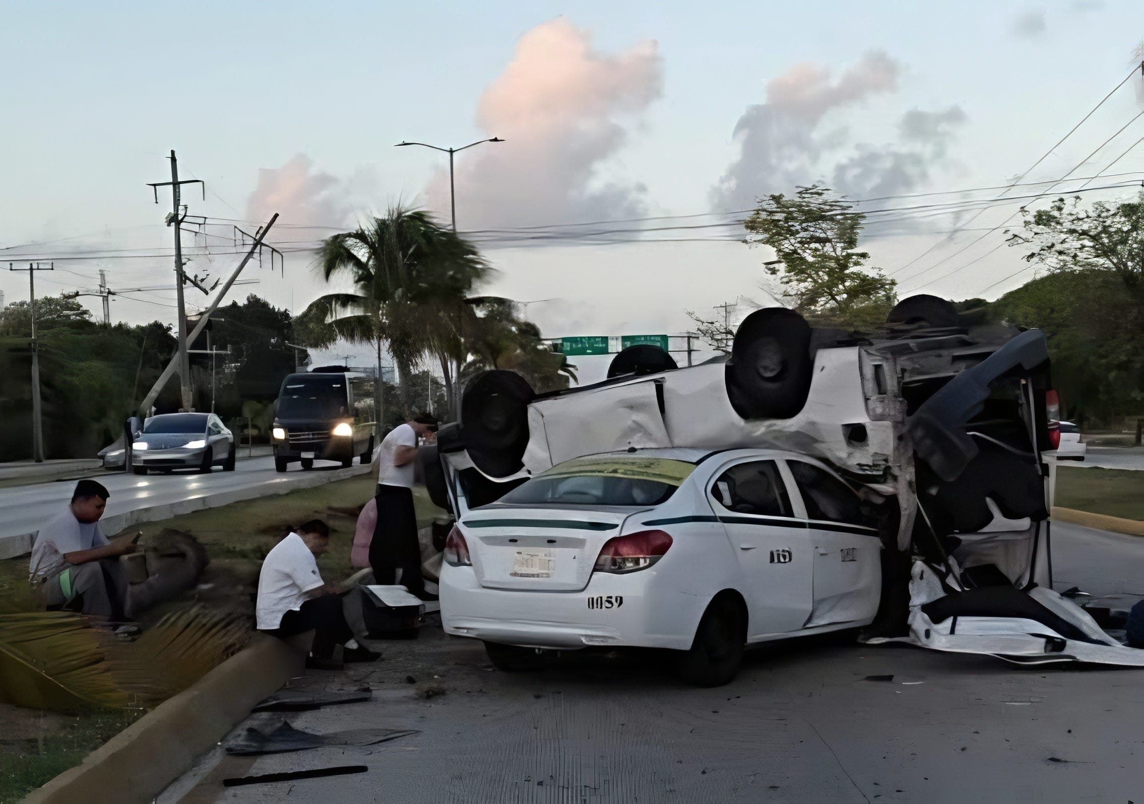 Taxi choca contra Combi de pasajeros en Av Tulum y mueren cuatro albañiles a bordo; hay 10 heridos, 2 críticos