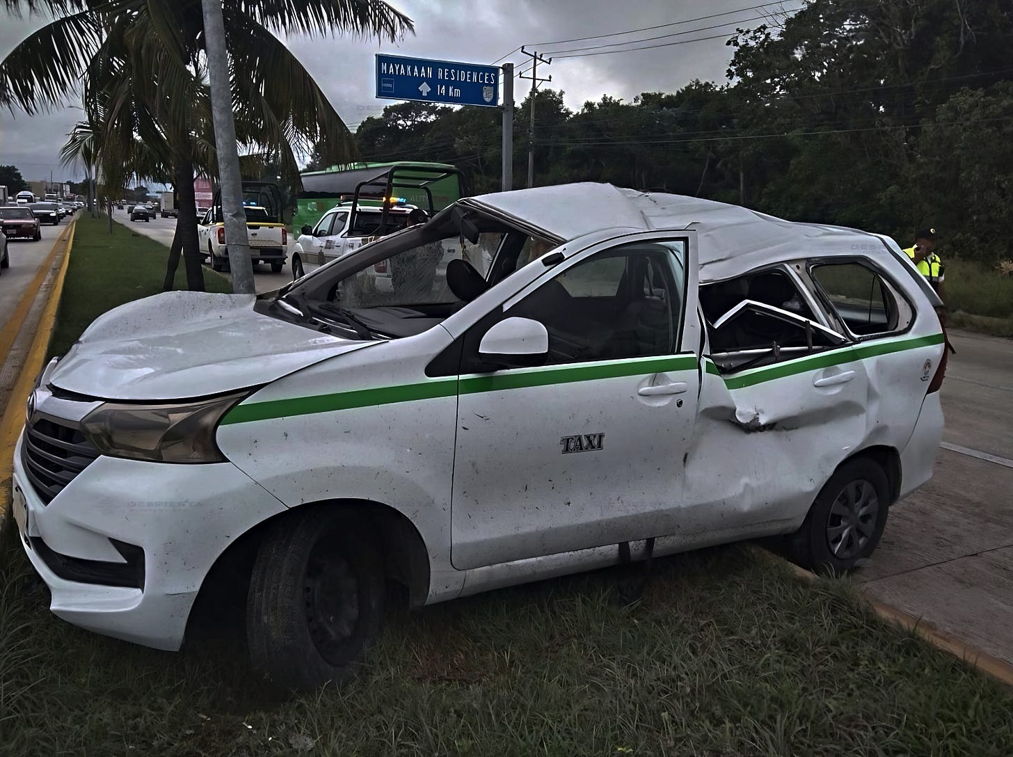 Cancún.— Un taxi Toyota Avanza, con placas blancas y verdes, terminó volcado este jueves alrededor de las 13:00 horas en el Boulevard Luis Donaldo Colosio, a la altura de las Bodegas APA, debido al exceso de velocidad y el manejo imprudente de su conductor.
