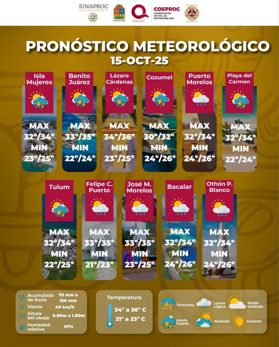 9. Othón P. Blanco (Chetumal): Cielo parcialmente nublado a nublado con chubascos, puntuales fuertes y rayos. Vientos variables 15 km/h. Muy caluroso: máx. 32-34°C, mín. mañana 24-26°C, sensación 37°C. Mareas altas 00:18/17:30 h. Sol 06:48-18:31 h. Presión 1011 hPa.