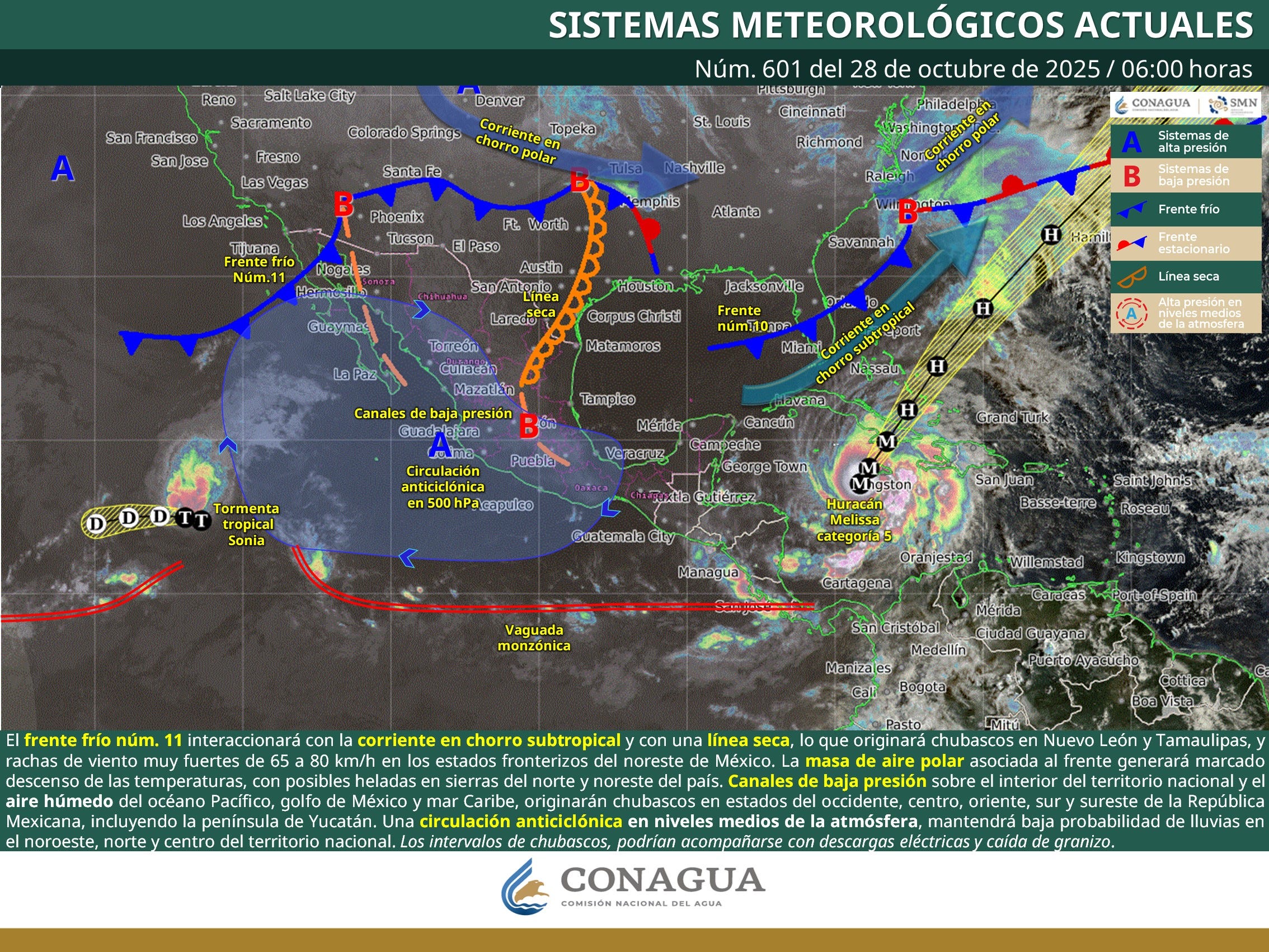 Luna creciente al 40%, visible para quien mire al cielo entre nubes. Y ojo al dato: el huracán Melissa, categoría 5, merodea el Caribe, pero su trayectoria la mantiene lejos; cero peligro para nosotros, gracias a los dioses mayas del viento.