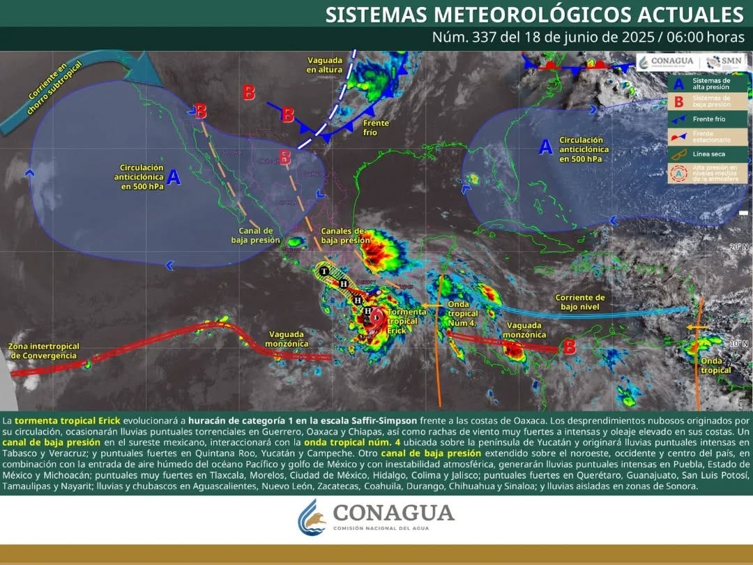 Chetumal.- Este miércoles 18 de junio de 2025, Quintana Roo enfrentará un día de condiciones climáticas desafiantes debido a la afluencia de aire marítimo tropical proveniente del Caribe, influenciada por la amplia circulación del ciclón tropical Erick, ubicado en el Pacífico frente a las costas de Chiapas y Oaxaca. El estado experimentará cielos de medio nublados a nublados, chubascos con lluvias puntuales fuertes, actividad eléctrica, y un ambiente muy caluroso durante el día, con vientos fuertes que alcanzarán rachas de hasta 70 km/h en zonas costeras.