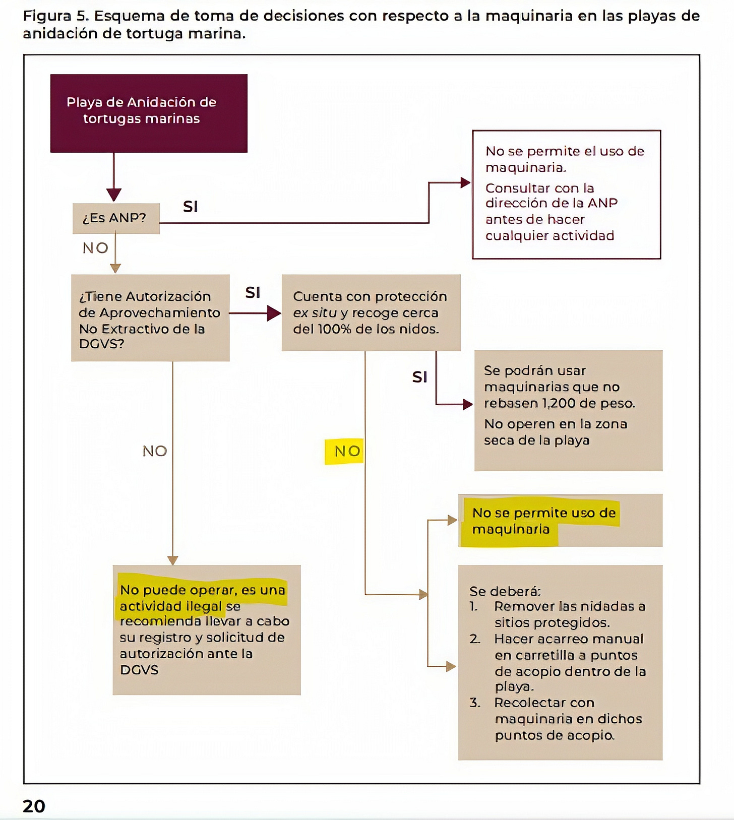 Desde el domingo, el colectivo ha documentado y difundido evidencias de esta práctica, incluyendo un diagrama de decisiones que establece claramente las restricciones para el uso de maquinaria en playas con nidos de tortuga, siempre que medie una autorización de las Áreas Naturales Protegidas (ANP) o la Dirección de Vida Silvestre (DVS). Sin embargo, las publicaciones de hoy sugieren que dichas normativas están siendo ignoradas, con la maquinaria dejando huellas visibles sobre la arena, a escasos pasos de marcadores que indican la presencia de huevos.