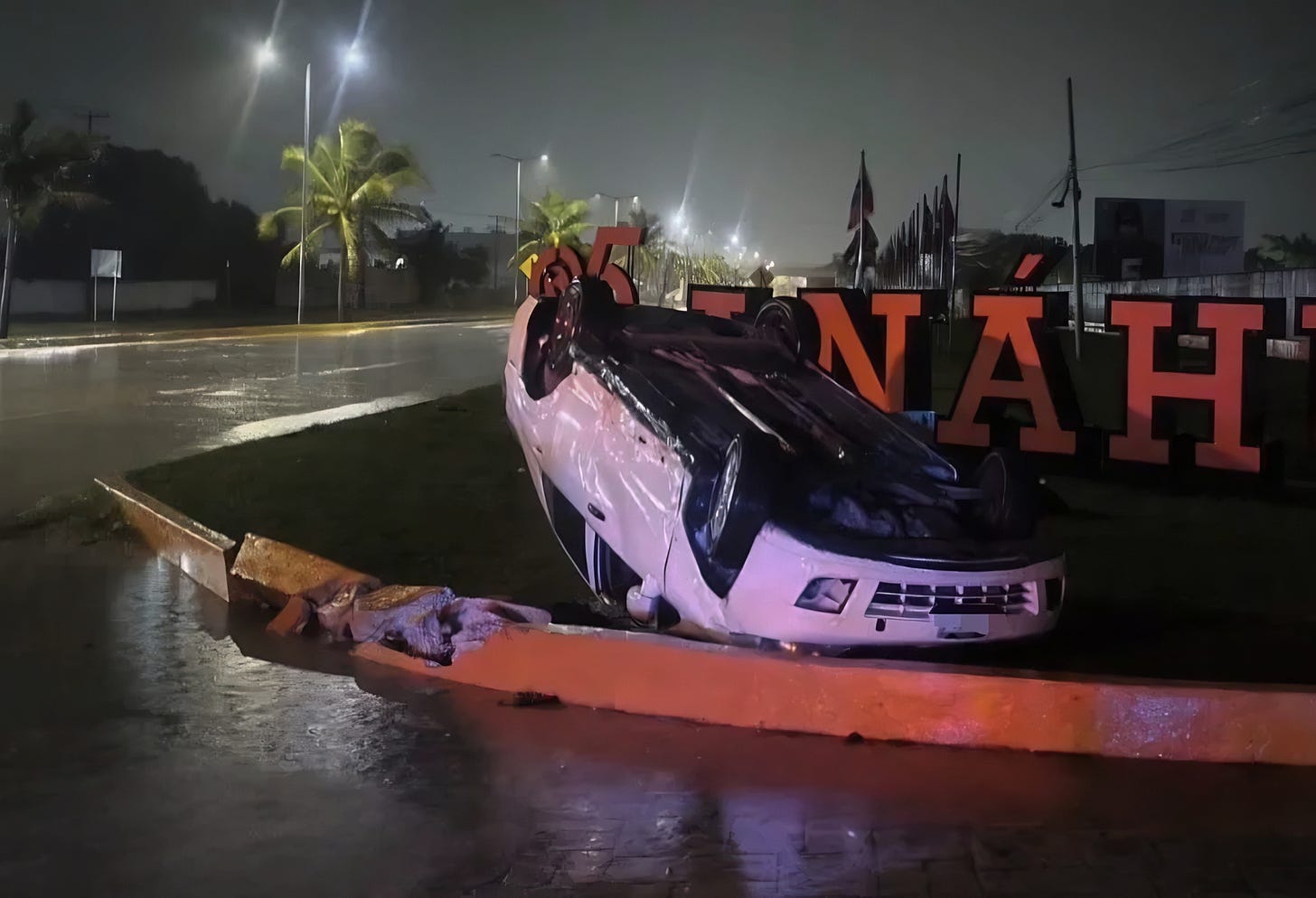Cancún.- Un auto Nissan Tiida blanco volcó la madrugada de este jueves 6 de noviembre sobre el bulevar Luis Donaldo Colosio, a unos metros de las mega-letras de la Universidad Anáhuac, en una zona que se ha convertido en un punto recurrente de accidentes similares. El conductor huyó del lugar abandonando el vehículo.