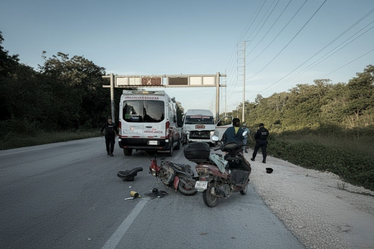 Tulum.— Un aparatoso accidente se registró la mañana de este martes a la altura del cenote Cristal, en la entrada a Tulum, cuando una motociclista fue impactada por un colectivo de la ruta Felipe Carrillo Puerto–Tulum–Playa del Carmen. La mujer circulaba sobre el acotamiento en dirección a Tulum y, al intentar incorporarse hacia la izquierda, se atravesó en la trayectoria de la van que avanzaba en sentido normal hacia la ciudad. El choque fue tan fuerte que la motociclista quedó tendida sobre el pavimento con lesiones graves en la cabeza, muñeca, brazos y piernas.