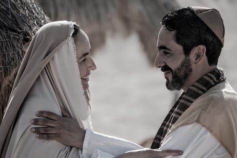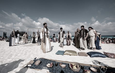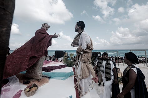 Viacrusis Playero 2025: Rafael Pérez Pasquel (Jesús) y María Coral Castro Montalvo (Virgen María) en el escenario de Playa Delfines de Cancún