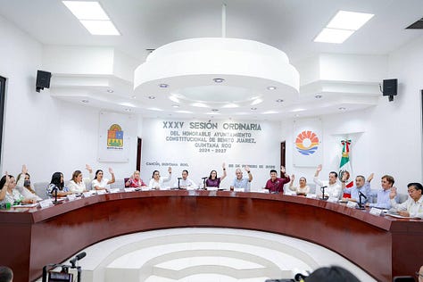 Cancún.- En el marco de la Trigésima Quinta Sesión Ordinaria, encabezada por la Presidenta Municipal, Ana Paty Peralta, el Cabildo de Benito Juárez autorizó por mayoría turnar a comisiones para mayor análisis la iniciativa para reformar diferentes normativas municipales, para fortalecer el marco normativo que regula el Servicio Profesional de Carrera del personal de la Secretaría Municipal de Seguridad Ciudadana y Tránsito, para actuar con rapidez ante abusos o corrupción, separando de inmediato del cargo a quien viole la ley mientras se investiga.