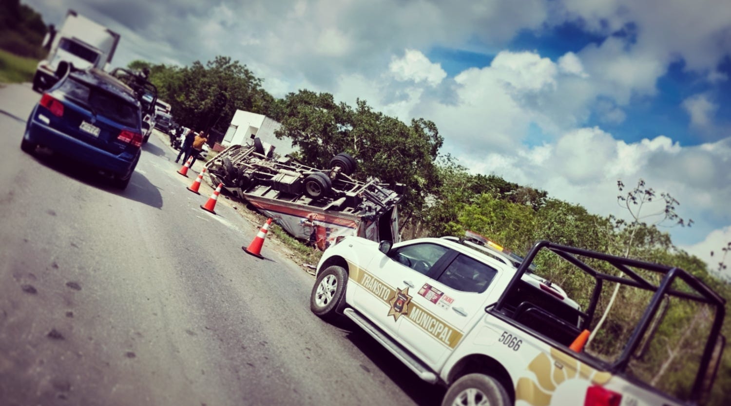 Cancún.- Un camión de carga protagonizó una aparatosa volcadura en la carretera Gas Auto, a unos cinco kilómetros de la avenida José López Portillo, en dirección a la autopista Cancún-Mérida. El incidente, ocurrido en una vía conocida por su alto flujo vehicular y antecedentes de accidentes, dejó el vehículo con las llantas hacia arriba y severos daños materiales. Contra todo pronóstico, el conductor y su acompañante salieron con vida, diagnosticados únicamente como policontundidos, según reportes de los servicios de emergencia que atendieron el llamado al 911.