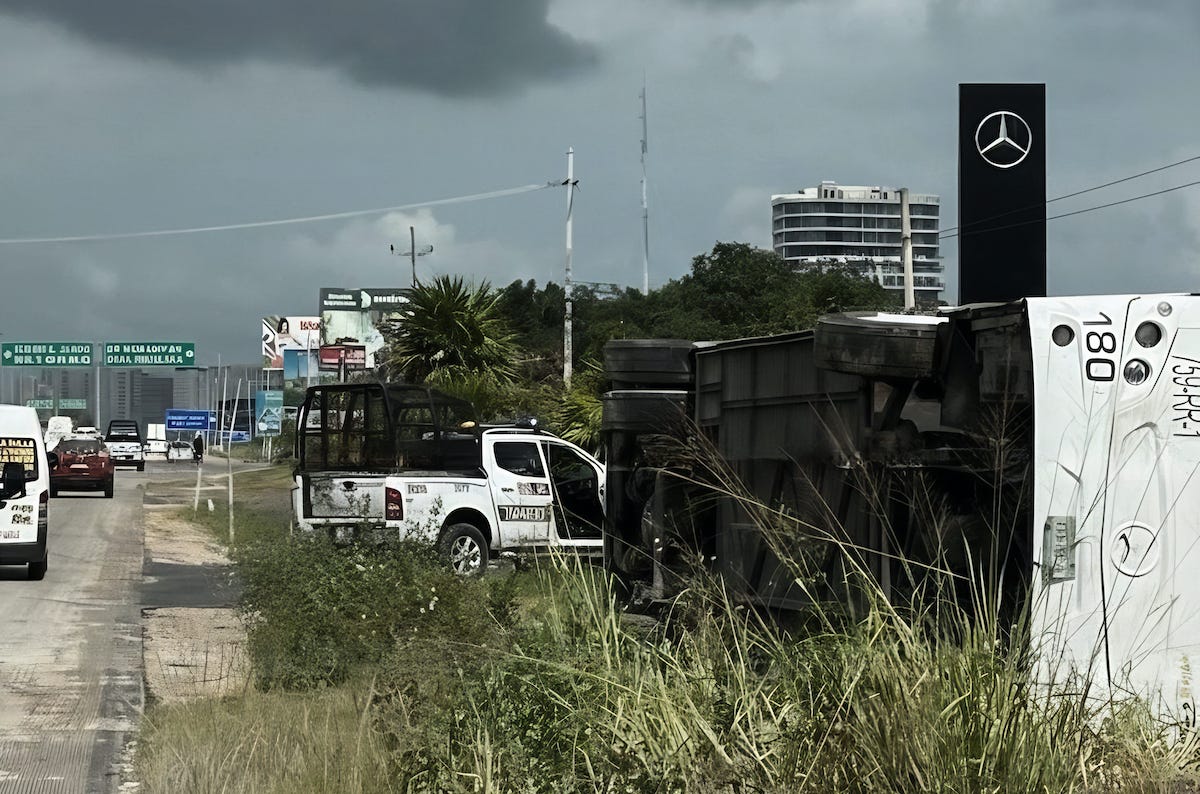 Vuelca camión de transporte de personal sobre la Av Colosio de Cancún; sólo un lesionado
