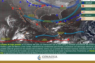 Cielo nublado, chubascos con puntuales de 25 a 50 mm, actividad eléctrica y bancos de niebla en todo el estado; temperaturas máximas de 29 a 34 °C